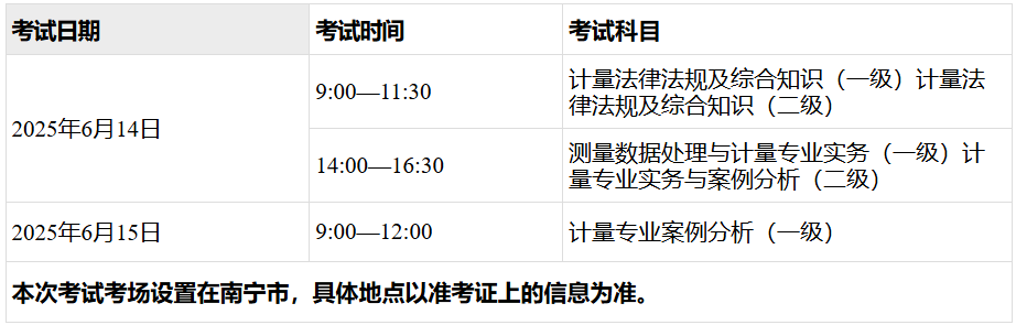根据《人力资源和社会保障部人事考试中心关于2025年度注册计量师职业资格考试考务工作的通知》(人考中心函〔2025〕9号)精神,为做好2025年度注册计量师职业资格考试广西考区考务工作,现将有关事项通知如下: