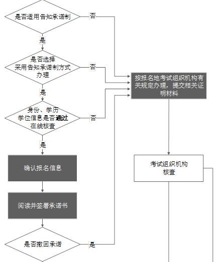 注册时,身份信息和学历(学位)信息在线核查结果为“核查通过”且选择并适用告知承诺制办理的报考人员,无需进行现场人工核查,系统将自动核查其报名资格,通过后直接缴费完成网上报名工作,届时打印准考证参加考试即可。
