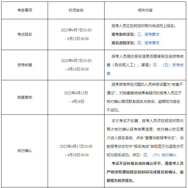 考试机构将于2025年4月15日-4月16日进行报考资格抽查复核,并将抽查复核中发现问题的人员设置为“核查不通过”。所有完成报名确认的考生应于2025年4月17日10:00重新登录报名系统查询核查状态,对人工核查或抽查复核结果有疑问的人员应于核对确认截止前联系报名点咨询,逾期视作报名不成功。