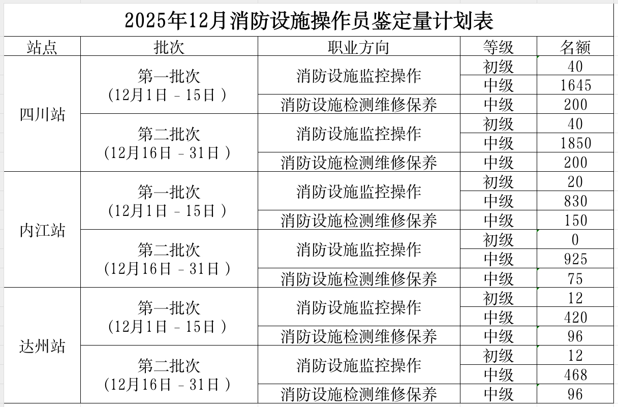 根据消防行业职业技能鉴定指导中心消防设施操作员职业技能鉴定工作安排(请参见“消防职业技能鉴定考试网”https://xfhyjd.119.gov.cn/#/index/),结合工作实际,四川省消防救援总队消防行业职业技能鉴定站、内江分站、达州分站计划开展消防设施操作员职业技能鉴定考核工作,现将有关事项通知如下(建议考生关注四川省消防救援总队训练与战勤保障支队公众号获取最新鉴定咨询):