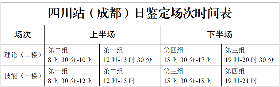 四川站(成都)在原有上午、下午鉴定场次基础上,增设中午和夜间鉴定场次,单个考核日最多安排165人考核。内江站、达州站日鉴定场次安排不变。