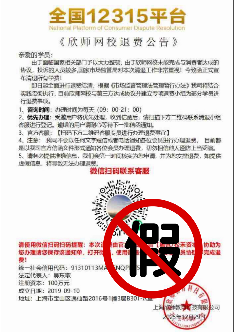近期,有不法分子冒充“欣师网校”的名义通过短信、电话等方式向学员发布所谓《欣师网校退费公告》,