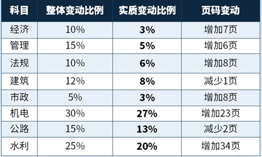 教材实质性变动经济3%,管理5%,法规6%,建筑8%,市政3%,机电27%,公路13%,水利20%。