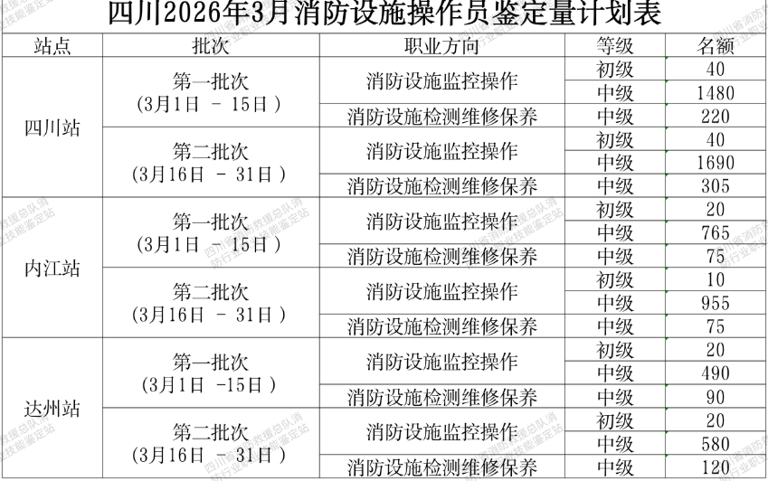 根据消防行业职业技能鉴定指导中心消防设施操作员职业技能鉴定工作安排(请参见“消防职业技能鉴定考试网”https://xfhyjd.119.gov.cn/#/index/),结合工作实际,四川省消防救援总队消防行业职业技能鉴定站、内江分站、达州分站计划开展消防设施操作员职业技能鉴定考核工作,现将有关事项通知如下(建议考生关注四川省消防救援总队训练与战勤保障支队公众号获取最新鉴定咨询):