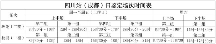 四川站(成都)在原有上午、下午鉴定场次基础上,增设中午和夜间鉴定场次,单个考核日最多安排170人考核。内江站、达州站日鉴定场次安排不变。