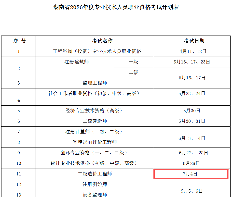 根据《湖南省2026年度专业技术人员职业资格考试计划表》,湖南省2026年二级造价工程师考试时间为7月4日。