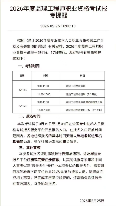 2026年监理工程师报名时间:3月12-31日