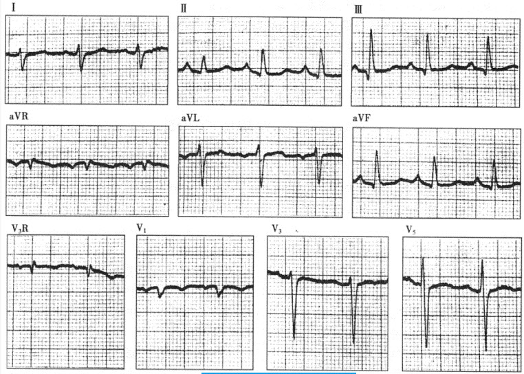 76岁,慢性咳喘33年,临床诊断慢性肺源性心脏病。心电图检查如图所示。