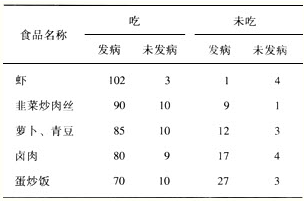 某公司职工146人于4月初春游,在餐馆用中餐。深夜,有16人在各自家中突发腹痛、腹泻、恶心、呕吐,怀疑发病与中餐有关。进一步追查有114人在两天内先后有症状,收集到110人饮食与发病史,结果如下:
