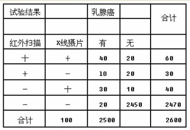 X线摄片两和方法在一批妇女中筛检乳腺癌,试验结果见表