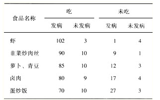 某公司职工146人于4月初春游,在餐馆用中餐。深夜,有16人在各自家中突发腹痛、腹泻、恶心、呕吐,怀疑发病与中餐有关。进一步追查有114人在两天内先后有症状,收集到110人饮食与发病史,结果如下: