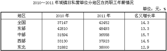 2011年全国城镇非私营单位在岗职工年薪为42452元,与2010年的37147元相比,增加了5305元,同比名义增长14.3%。扣除物价因素,2011年全国城镇非私营单位在岗职工年薪实际增长8.5%