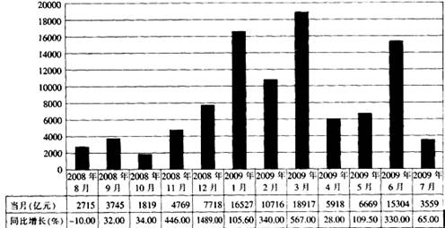 中国人民银行8月11日公布的数据显示,2009年1~7月人民币各项贷款增加7.73万亿元,同比多增4.89万亿元。2009年7月末,广义货币供应量(M2)余额为57.30万亿元,同比增长28.42%,增幅比上年末高10.6个百分点,比6月末低0.03个百分点;狭义货币供应量(M1)余额为19.59万亿元,同比增长26.37%,比6月末高1.6个百分点;市场货币流通量(M0)余额为3.42万亿元,同比增长11.59%。另据统计,7月份央行公开市场操作回笼资金量为6630亿元,而到期释放的资金量却达到8160亿元。