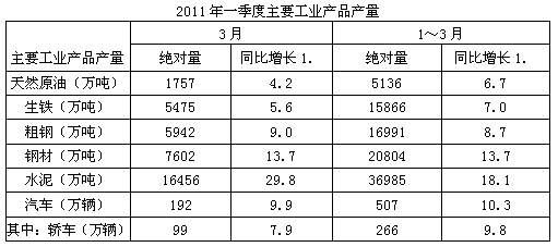2011年一季度我国国民经济保持平稳较快增长。一季度国内生产总值96311亿元,按可比价格计算,同比增长9.7%。分产业看,第一产业增加值5980亿元,增长3.5%;第二产业增加值46788亿元,增长11.1%;第三产业增加值43543亿元,增长9.1%。从环比看,一季度国内生产总值增长2.1%。工业生产平稳增长,企业效益继续增加。