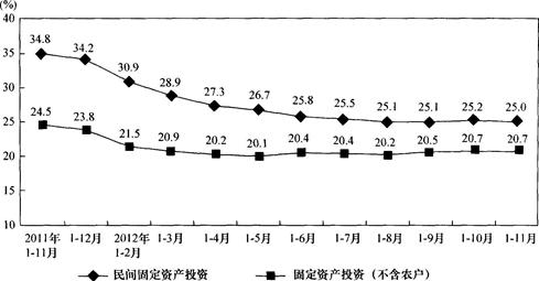 2012年1~11月份,全国民间固定资产投资201624亿元,同比增长25%。民间固定资产投资占固定资产投资的比重为61.8%,比1~10月份下降0.1个百分点。分地区看,东部地区民间固定资产投资99138亿元,比去年同期增长21.7%,增速比1~10月份回落0.1个百分点;中部地区民间固定资产投资61852亿元,增长28.1%,增速与1~10月份持平;西部地区民间固定资产投资40634亿元,增长28.9%,增速比1~10月份回落0.6个百分点。