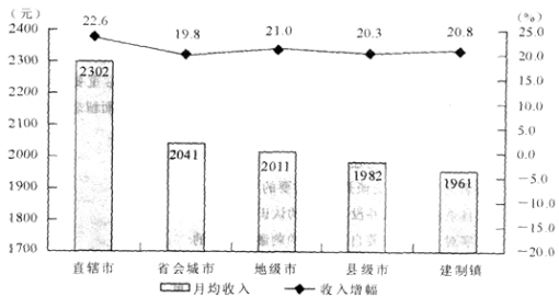 1.2011年在直辖市就业的外来农民工月均收入同2010年相比,增加了(  )。