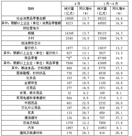 20126月份社会消费品零售总额主要数据