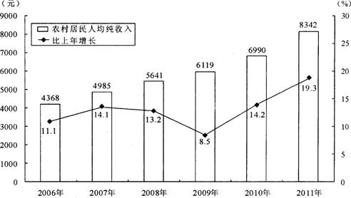2011年,我国农村居民人均工资性收入3715元,增长25.6%;农村居民人均生活消费支出5901元,增长22.7%,其中,食品支出2107元,增长16.8%