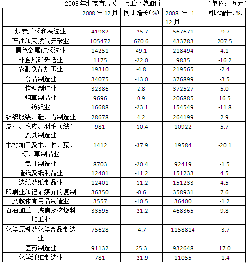 1.2008年12月北京市规模以上工业中,增加值同比下降的行业有:( )。