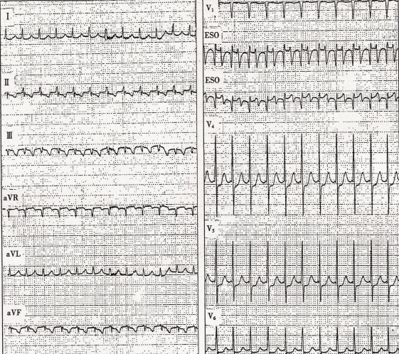 患者女性,56岁,反复发作心悸,心电图检查如图所示(图中ESO为食管导联心电图)。