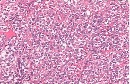 患者男,60岁。因“呕血3小时”急诊就医。胃镜检查,发现胃体后壁巨大隆起肿块,表面黏膜糜烂。肿块固定,边界尚清,大小约5.2cm×4.9cm。胃窦部黏膜高低不平部分呈颗粒状。胃镜活检标本组织学检查,显示病变由异型上皮样细胞组成,形态如图所示。