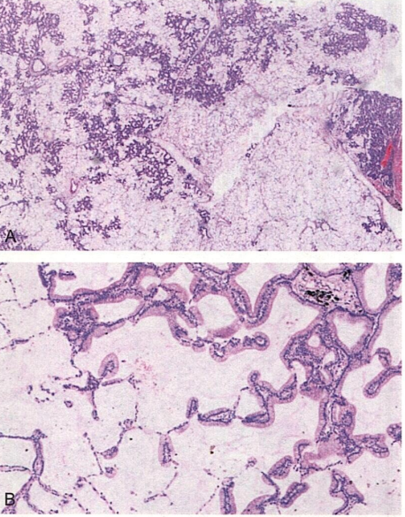 患者女,55岁。咳嗽、咳痰带血。X线显示右下肺野多灶性阴影。镜下改变如图所示。