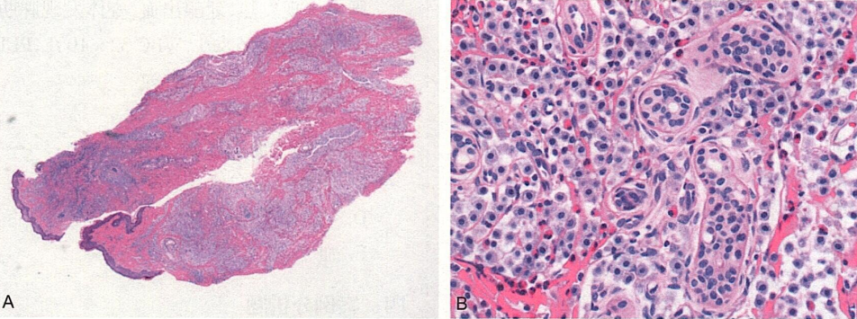 患者男,44岁。发现腹壁皮肤病变1个月,病变形态如图所示。