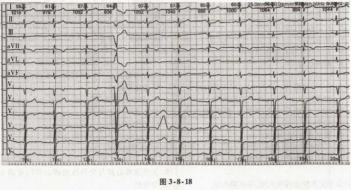 患者女性,13岁,心慌就诊。心电图见图3-8-18。超声心动图示LA35mm,LV54mm,EF值45%。