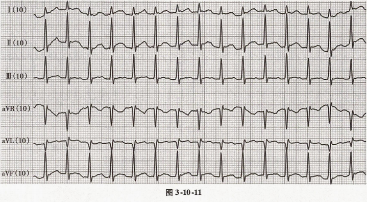 患者女,32岁。反复发作心悸5余年,加重3个月。入院时体检无阳性体征。门诊心电图大致正常。超声心动图未见异常。心动过速发作时常规12导联心电图见图3-10-11。