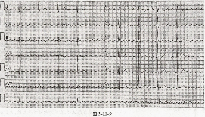 患者男性,45岁,心慌、气促就诊,否认高血压、糖尿病及脑卒中病史。超声心动图示LA45mm,LV56mm,EF值40%。心电图见图3-11-9。