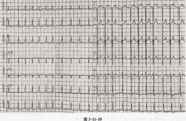 患者男性,70岁,心慌、气促就诊。2年前患者多次查心电图为心房颤动。超声心动图示LA42mm,LV50mm,EF值56%。心电图见图3-11-10。