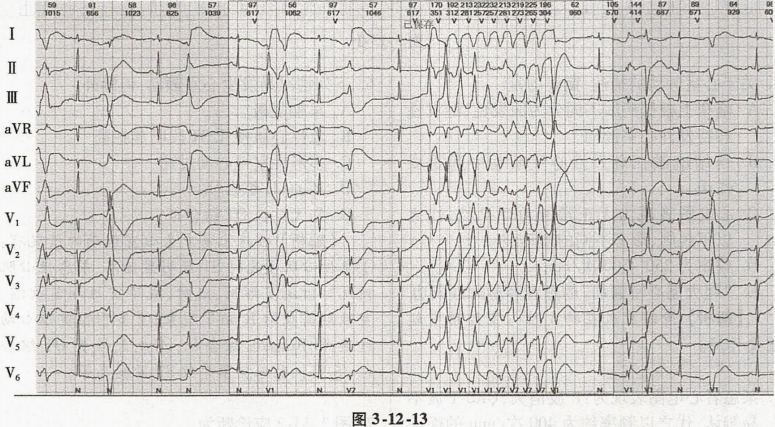 患者男性,67岁,心悸、头晕2天就诊。有晕厥史。高血压病史8年,2型糖尿病病史5年。体格检查:BP135/78mmHg。患者精神差,双肺呼吸音粗,闻及散在湿啰音。HR60次/min,心律不齐,各瓣膜听诊区未闻及杂音。辅助检查:血、尿常规、肝肾功能正常。血糖13.80mmol/L,肌钙蛋白0.596ng/ml。胸片示双肺感染,左侧胸腔积液。超声心动图:左心房扩大(36mm),左心室扩大(57mm)。动态心电图片段见图3-12-13。临床诊断:高血压,缺血性心肌病,心律失常;2型糖尿病;肺部感染。