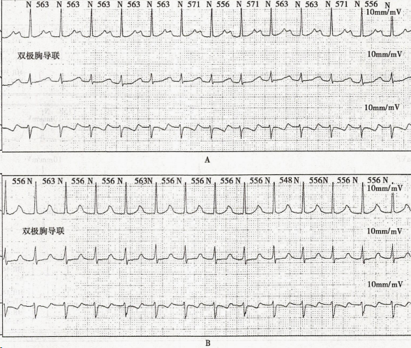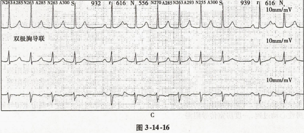 患者男性,33岁,心悸1周就诊。动态心电图检查如图3-14-16A、B、C所示。