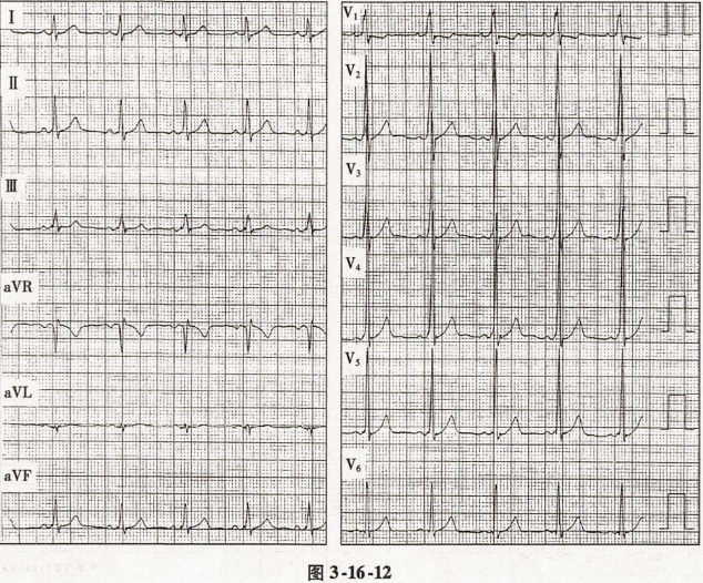 患者男性,40岁,多次发作心悸,心电图见图3-16-12,显示为预激图形。