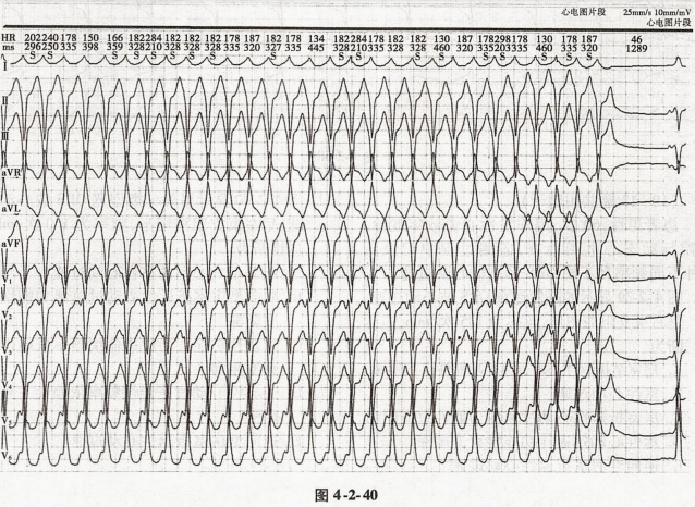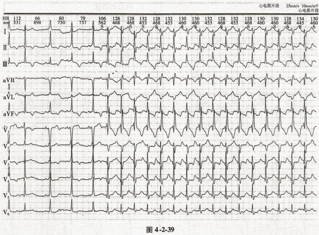 患者男性,60岁,因阵发性心慌数年就诊,住院行动态心电图检查,监测过程中记录到2种不同频率和不同QRS形态的心动过速。
