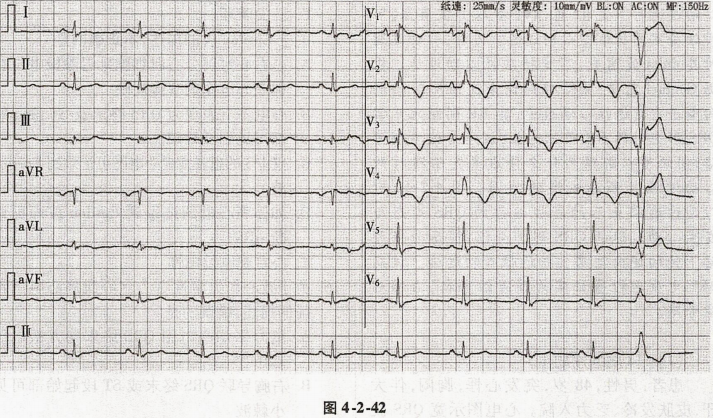 患者,男性,48岁,突发心悸,胸闷,伴大汗、皮肤发冷、乏力入院。心电图示宽QRS波心动过速(见图4-2-41),HR169次/min,脉搏、血压测不出,给予胺碘酮150mg静推并持续静脉泵入,多巴胺静脉泵入,行同步电复律后转复为窦性心律(图4-2-42)。患者有高血压,糖尿病病史。心室晚电位阳性。动态心电图:可见多源室性期前收缩8474次,部分呈二、三联律,成对出现188次,连发3跳的短阵室性心动过速4次,频率101~137次/min,右束支阻滞。超声心动图:LA35mm,RA55×69mm,RV74mm,右心增大、右心室收缩功能减低,三尖瓣中度关闭不全,EF57%。心脏磁共振:右心增大,右心室收缩功能减低,右心室壁变薄并向外膨隆,厚约1.3mm,右心室流出道呈瘤样扩张,宽约50mm,RA横径51mm,考虑为致心律失常性右心室心肌病(ARVC)。临床诊断:致心律失常性右心室心肌病(ARVC),室性心动过速,高血压,2型糖尿病。心电图诊断:双心房肥大,右束支阻滞,Epsilon波(V₁~V₃导联QRS波群终末呈现毛刺状小棘波),室性期前收缩,室性心动过速。