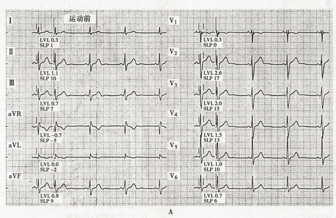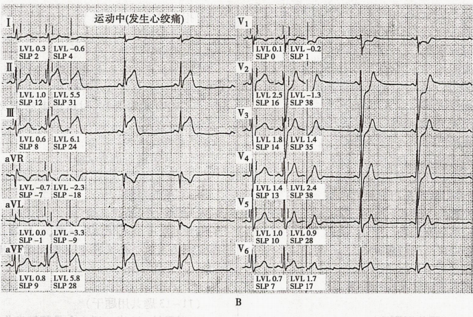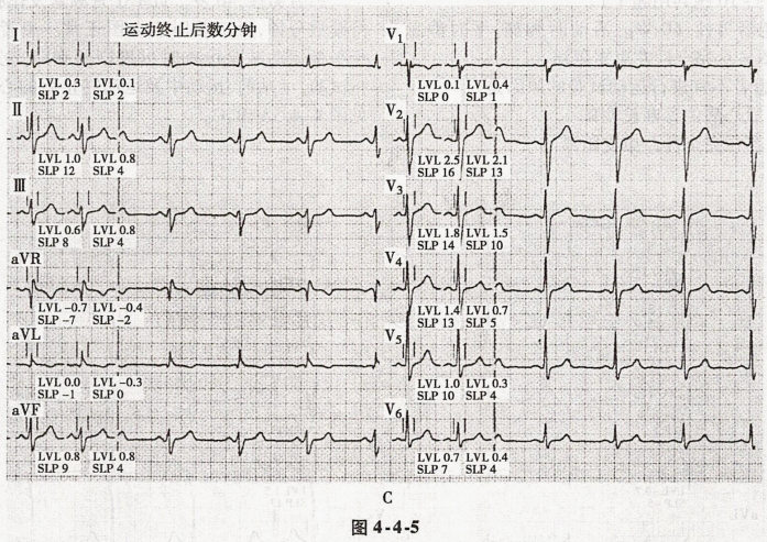 患者男性,46岁。近1个月频繁发作胸痛,持续数分钟,无症状时心电图正常。患者在进行平板运动试验检查时出现剧烈胸痛,立即终止试验,运动前、运动中及运动终止后的心电图见图4-4-5A、B、C。