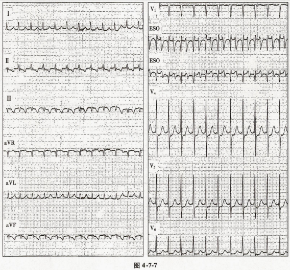 1.用超速抑制方法,刺激频率从200~300次/min均不能终止心动过速,当刺激频率达到420次/min时,心动过速终止,转为窦性心律,提示图4-7-7的诊断可能为