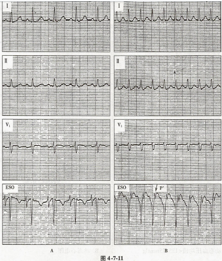 患者男性,15岁,反复发作心动过速。窦性心律时心电图可见两种固定的PR间期,分别为0.17秒和0.30秒。食管心房调搏检查诱发出室上性心动过速,如图4-7-11(图中ESO为食管导联心电图)所示。