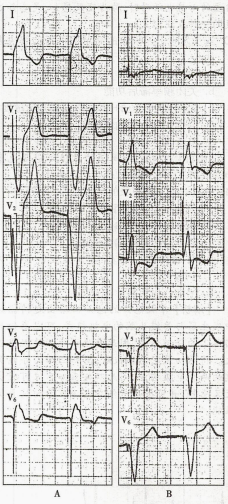患者女性,57岁,因房室传导阻滞植入起搏器。图4-8-19A为植入起搏器后即时的心电图,图4-8-19B为植入起搏器后6个月复查的心电图。