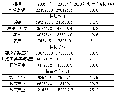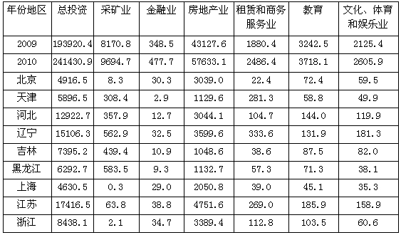 表2 2010年各部分地区行业的城镇固定资产投资(亿元)