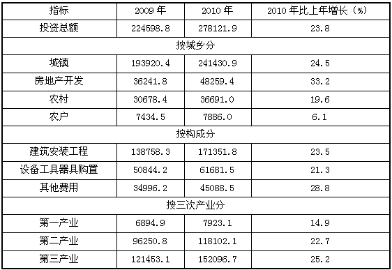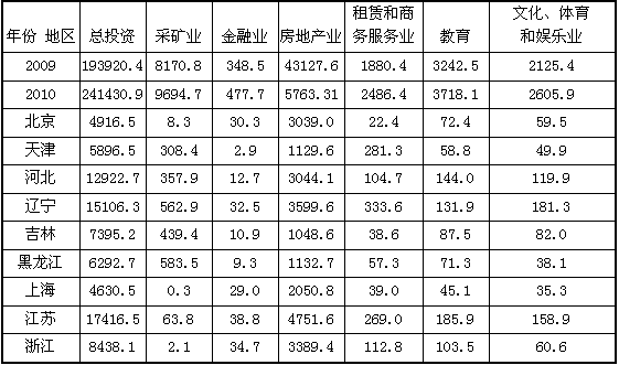 表2 2010年各部分地区行业的城镇固定资产投资(亿元)