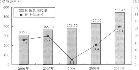 2010年,我国民航全行业完成运输总周转量538.45亿吨公里,其中旅客周转量359.55亿吨公里,比上年增长l9.5%;货邮周转量178.90亿吨公里,比上年增长41.7%。
