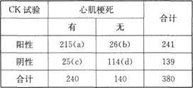240例心梗患者和140例非心梗患者进行血清肌酸激酶(CK)测定(≥80IU为+,<80IU为-)结果如下: