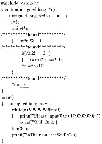 给定程序中,函数fun的功能是:将形参n所指变量中,各位上为偶数的数去除,剩余的数按原来从高位到低位的顺序组成一个新的数,并通过形参指针n传回所指变量。例如,输入一个数27638496,新的数为739。