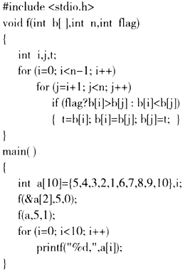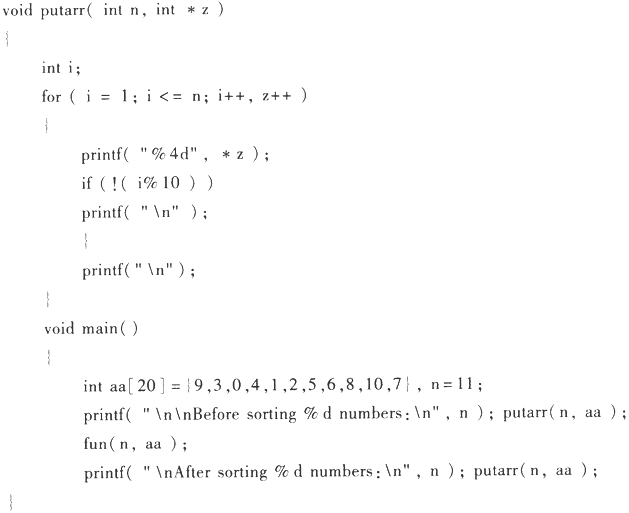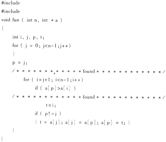 下列给定程序中,函数fun()的功能是:将n个无序整数从小到大排序。请改正程序指定部位的错误,使它能得到正确结果。注意:不要改动函数main(),不得增行或删行,也不得更改程序的结构。