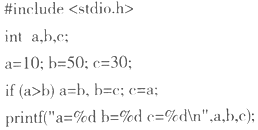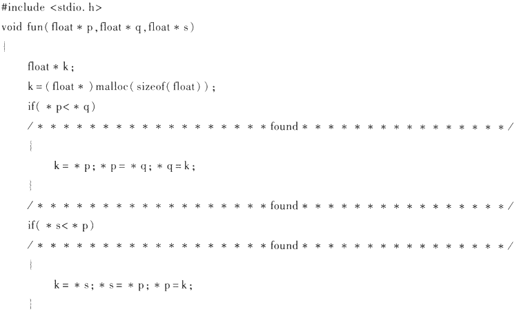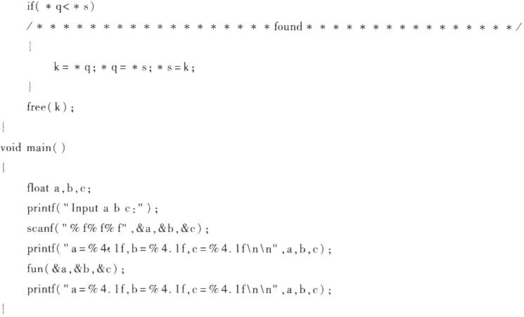 下列给定的程序中,函数fun的功能是:把主函数中输入的3个数,最大的放在a中,最小的放在c中。例如,输入的数为55 12 34,输出结果应当是:a=55.0,b=34.0,c=12.0。