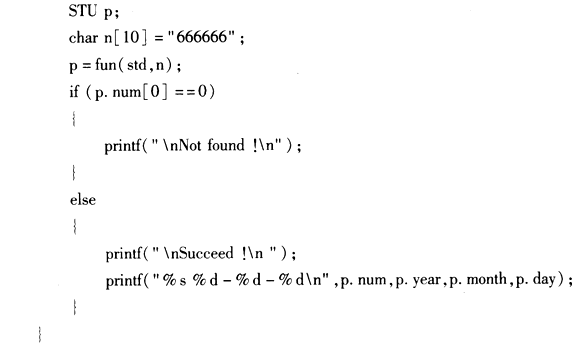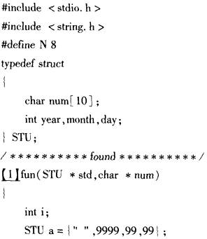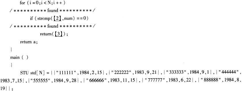 人员的记录由编号和出生年、月、日组成,N名人员的数据已在主函数中存入结构体数组std中,且编号唯一。函数fun的功能是:找出指定编号人员的数据,作为函数值返回,由主函数输出,若指定编号不存在,返回数据中的编号为空串。