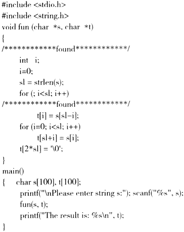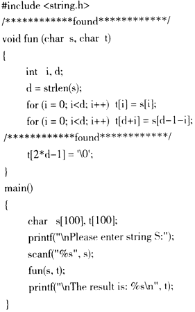 例如,当s所指字符串为:“ABCD”时,则t所指字符串中的内容应为:“ABCDDCBA”。请改正程序中的错误,使它能得出正确的结果。