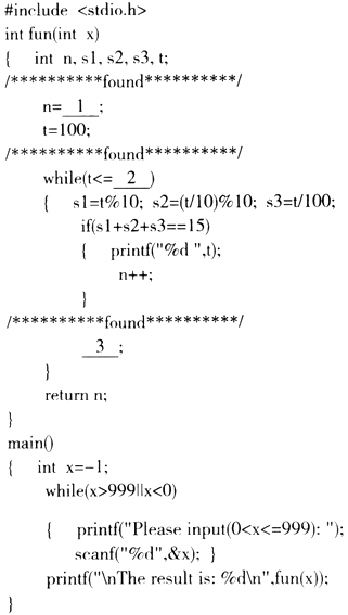 给定程序中,函数fun的功能是:找出100至x(x≤999)之间各位上的数字之和为15的所有整数然后输出;符合条件的整数个数作为函数值返回。